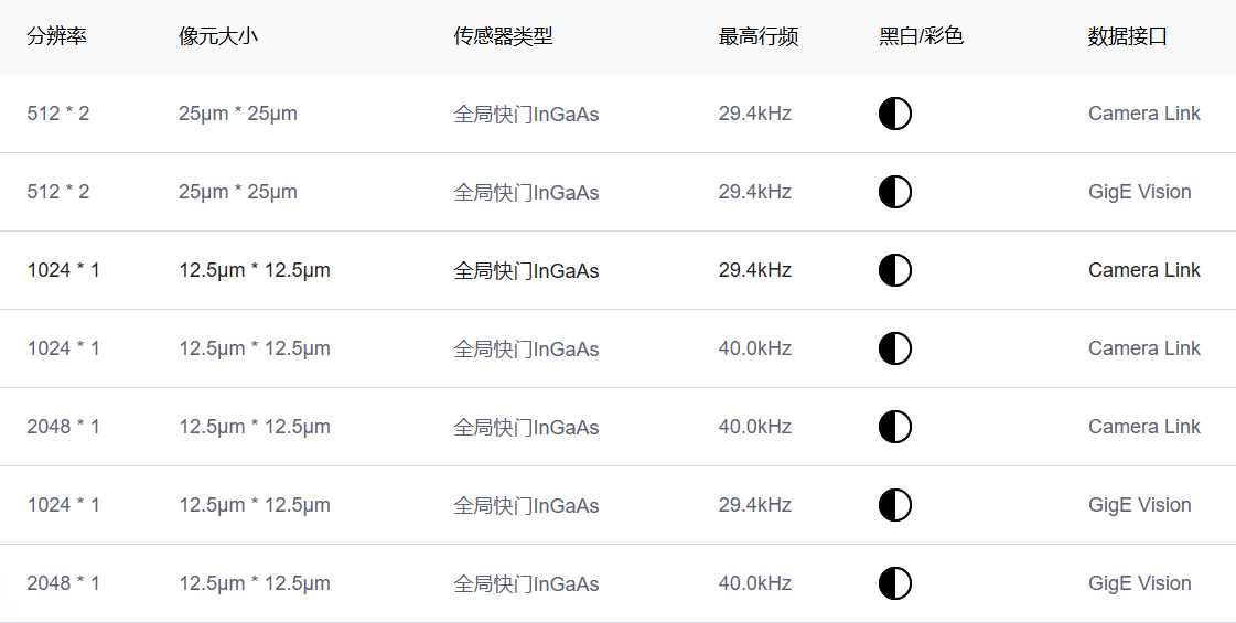 分辨率涵蓋0.5-2K,支持GigE、Camera Link等數據接口