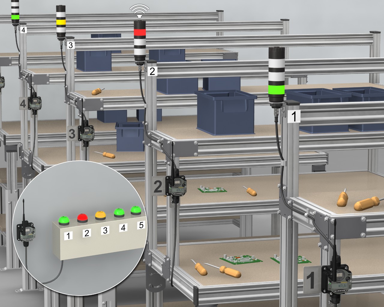 為了提高效率,工作站的裝配工需要通過一種方法,在不離開工作站的情況下進(jìn)行呼叫補(bǔ)給零部件和提供服務(wù)。 更快地獲得部件將提高生產(chǎn)效率,而使用遠(yuǎn)程指示器系統(tǒng)可以讓主管掌控每個(gè)工作站的狀態(tài),從而讓管理人員能夠快速解決生產(chǎn)問題并匯總生產(chǎn)指標(biāo)。