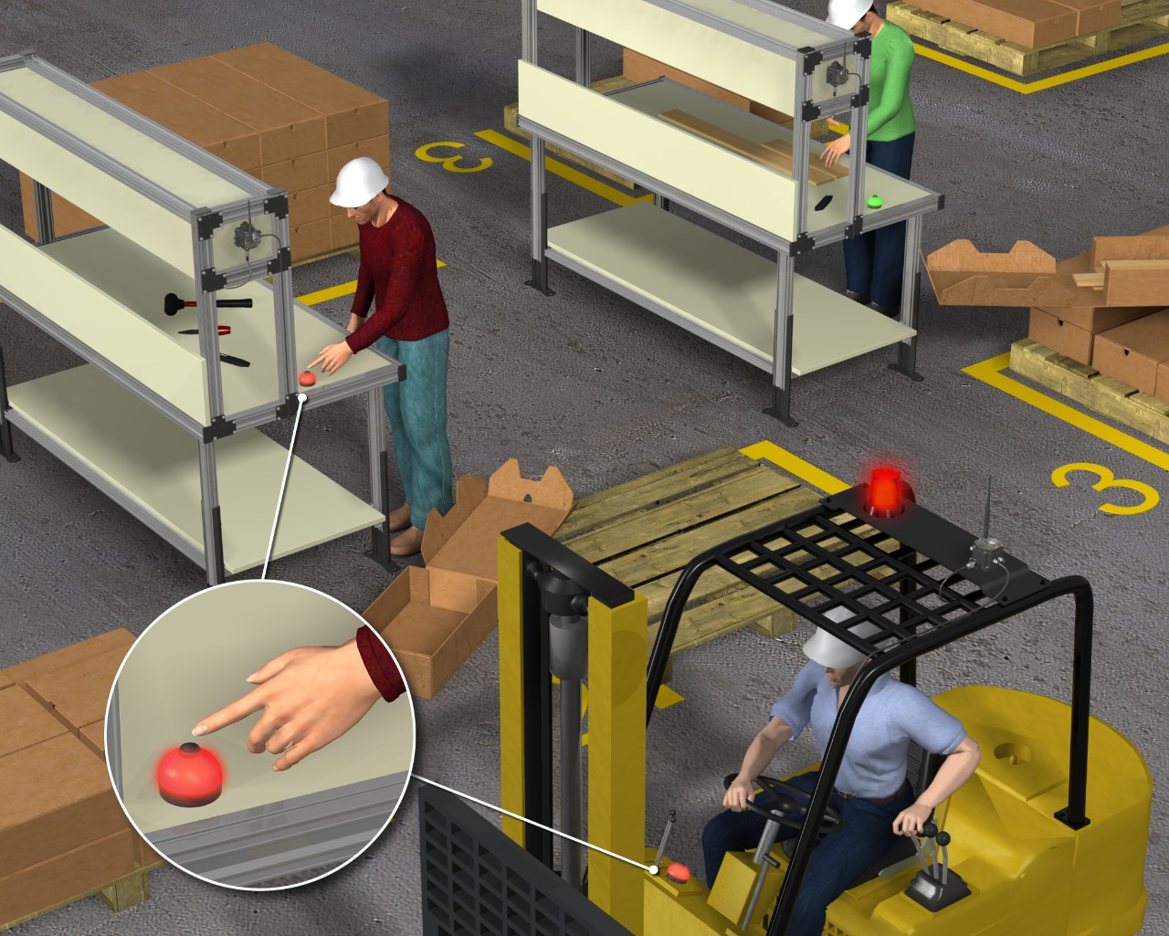 將亮起K50指示燈、叉車駕駛室中的K30以及燈塔燈同時(shí)點(diǎn)亮。叉車操作員則按下安裝在叉車上