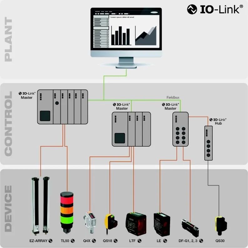 在工廠自動化功能網(wǎng)絡(luò)中,IO-Link通訊位于執(zhí)行層(包括各類傳感器和執(zhí)行器)和現(xiàn)場層之間,負責設(shè)備和主站間的信息交換,同時,IO-Link主站作為執(zhí)行層和現(xiàn)場控制層實現(xiàn)信息傳輸?shù)木W(wǎng)關(guān),真正實現(xiàn)了將IO-Link設(shè)備接入現(xiàn)場總線/工業(yè)互聯(lián)網(wǎng),進行傳感器級的網(wǎng)絡(luò)管理和控制。
