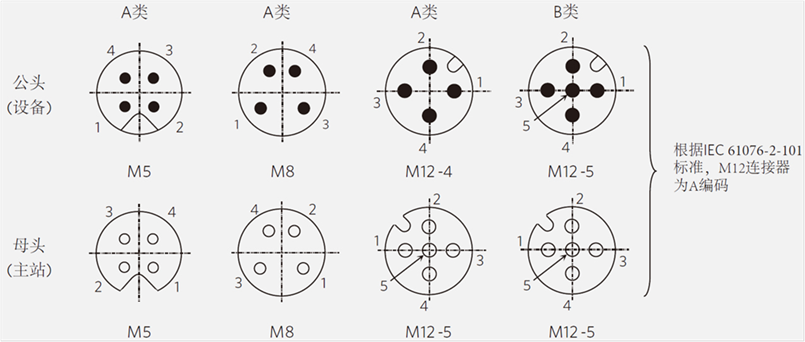 每個IO-Link設(shè)備都要連接到IO-Link主站的一個通道上,因此,IO-Link是點對點的通信協(xié)議,而不是總線協(xié)議。IO-Link設(shè)備分為傳感器和執(zhí)行器,前者通常是4針M8或M12接口,后者通常是5針M12接口。IO-Link設(shè)備針腳定義如下: