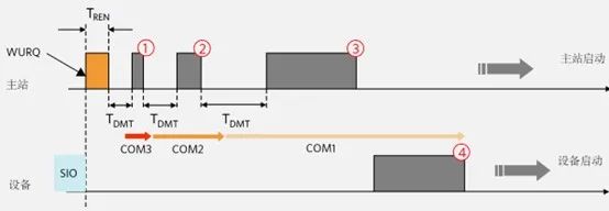 當主站首次與設(shè)備通訊或需要配置時,主站會發(fā)送1個喚醒請求,喚醒周期通常為80 us(最小值75 us,最大值85 us)。主站提供(或吸收)電流以生成喚醒脈沖,如果線路為低電平,主站將提供電流以將其拉高,反之亦然,喚醒請求通過至少500 mA的電流脈沖將C/Q線短接80 us,設(shè)備必須在500 us(TREN)內(nèi)準備好進行通訊,IO-Link設(shè)備通過電路上電壓變化來檢測喚醒脈沖。收到喚醒請求后,IO-Link設(shè)備必須將自身配置為接收模式,該過程必須在500 us內(nèi)完成。
