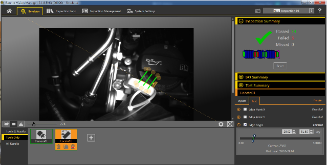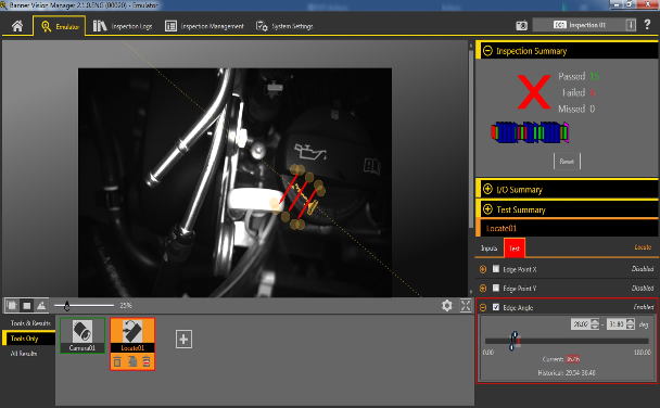 VE205G1A+12mm鏡頭,相機(jī)安裝在工件下方拍照檢測,使用紅色環(huán)形光源進(jìn)行檢測,使用Profinet通訊,不同位置不同程序,通過切換指令進(jìn)行檢測。使用Locate工具作為定位工具,通過角度位置檢測,判斷發(fā)動機(jī)油箱標(biāo)尺安裝到位。