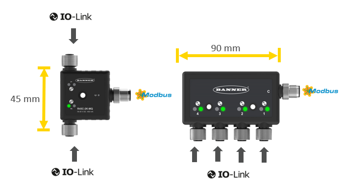 而IO-LINK集線器,可以將多個開關(guān)輸出的傳感器濃縮到一個IO-LINK集線器中,和上位控制器的連接也只需要要一根非屏蔽三芯/五芯電纜就可以,極大的減少電纜數(shù)量以及電氣安裝的工作量。以邦納R90C HUB為例: