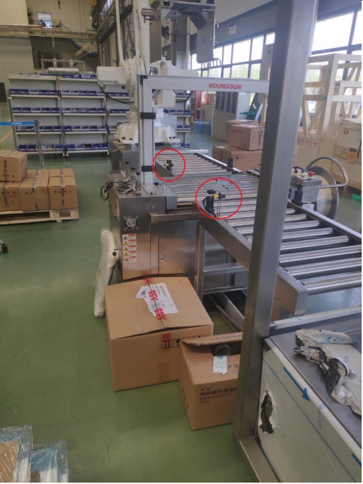 檢測打包機(jī)前輸送帶上包裝箱到位及包裝箱離開打包工序。