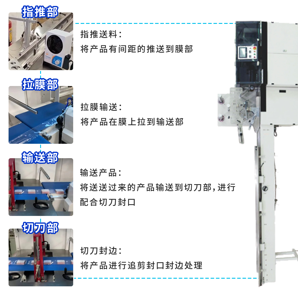 連續(xù)邊封機設(shè)備用于各類產(chǎn)品的包裝,屬于包裝行業(yè)第二道生產(chǎn)工序設(shè)備。主要由指推機構(gòu)、拉膜機構(gòu)、輸送機構(gòu)、切刀機構(gòu)四個大體機械模塊功能部分組成。