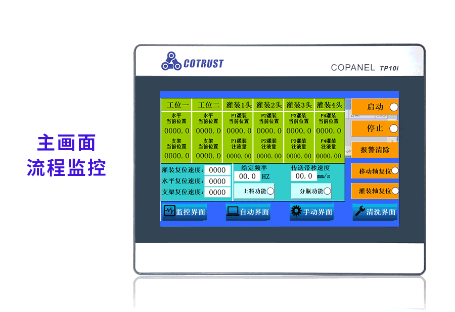 不同工位在觸摸屏上對(duì)應(yīng)位置按鈕,設(shè)置不同參數(shù),以及復(fù)位報(bào)警操作。