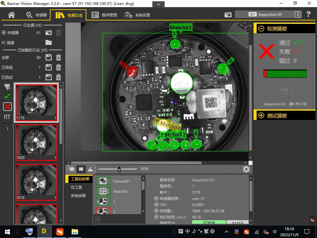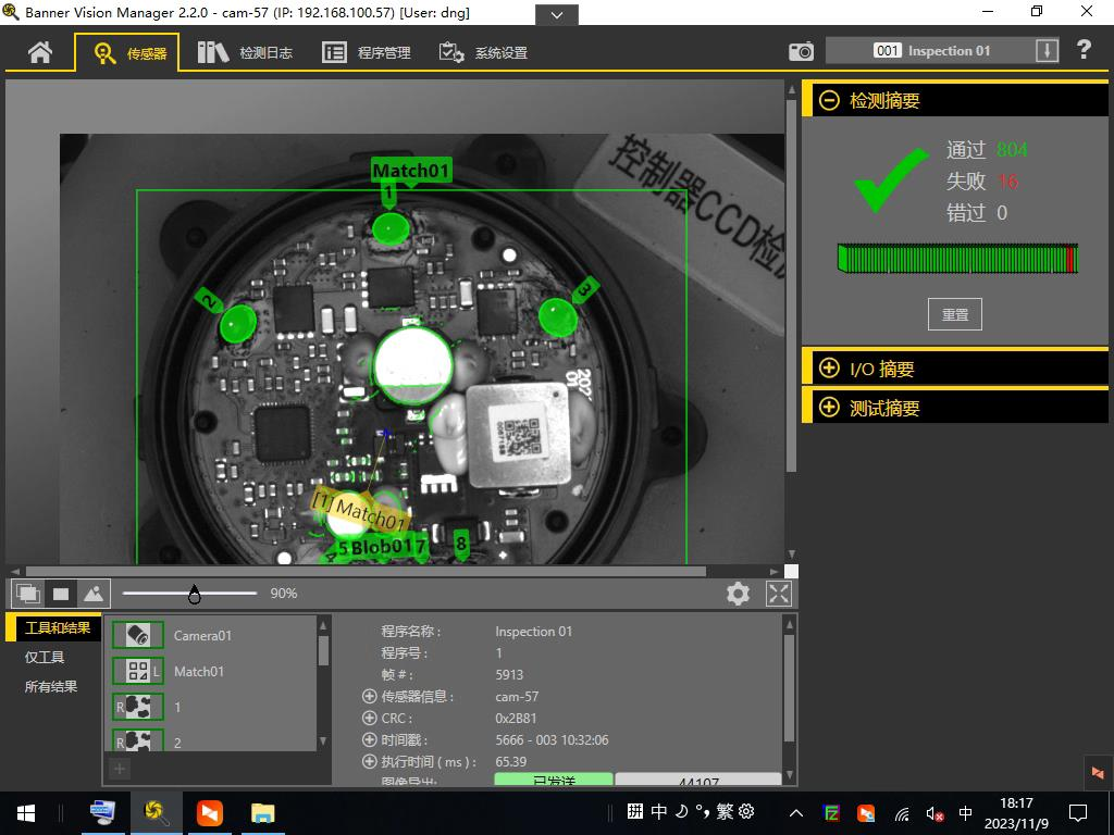 采用VE相機(jī),配合紅色環(huán)形低角度光源,采用二值化工具、邏輯工具等進(jìn)行檢測(cè)。