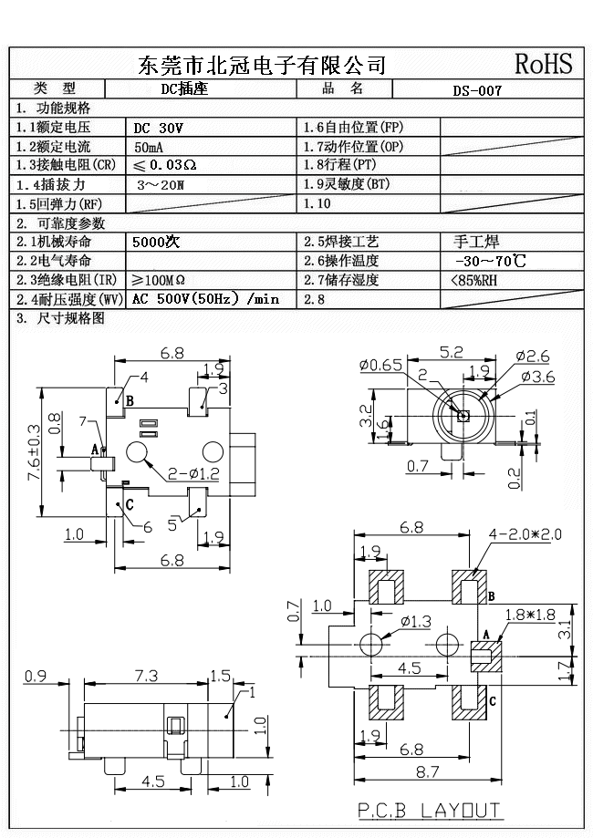 Typical Specifications 1. Rating : DC 30V 0.5A 2. Contact Resistance : 70?Max 3.Lnsulation Resistance: DC500V 1Minute 4.Operating Temperature Range: -25℃+80℃ 5.Ambient Humidity Used: ≤85%RH 6. Operating Force : 3-20N 7. Operating Life : 5,000Cycles