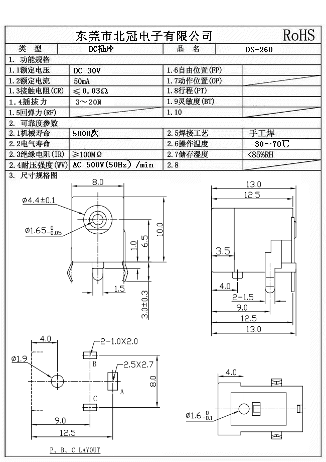 Typical Specifications 1. Rating : DC 30V 0.5A 2. Contact Resistance : 70?Max 3.Lnsulation Resistance: DC500V 1Minute 4.Operating Temperature Range: -25℃+80℃ 5.Ambient Humidity Used: ≤85%RH 6. Operating Force : 3-20N 7. Operating Life : 5,000Cycles