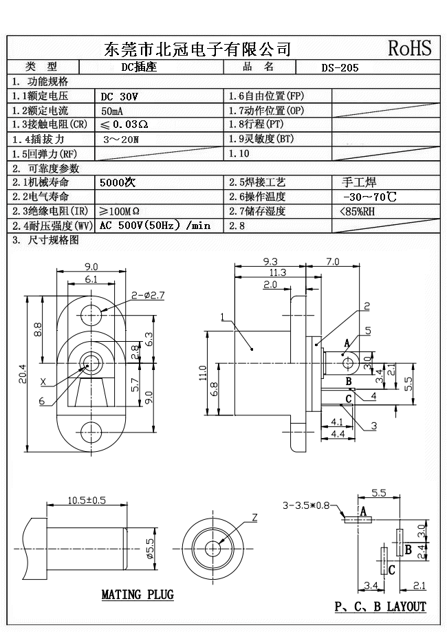 Typical Specifications 1. Rating : DC 30V 0.5A 2. Contact Resistance : 70ΩMax 3.Lnsulation Resistance: DC500V 1Minute 4.Operating Temperature Range: -25℃+80℃ 5.Ambient Humidity Used: ≤85%RH 6. Operating Force : 3-20N 7. Operating Life : 5,000Cycles