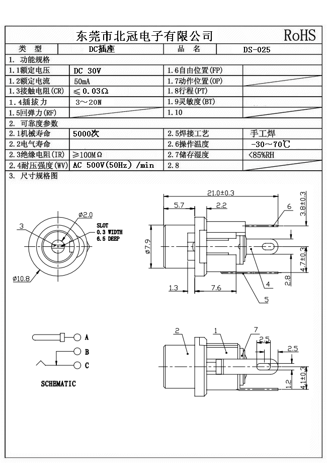 Typical Specifications 1. Rating : DC 30V 0.5A 2. Contact Resistance : 70ΩMax 3.Lnsulation Resistance: DC500V 1Minute 4.Operating Temperature Range: -25℃+80℃ 5.Ambient Humidity Used: ≤85%RH 6. Operating Force : 3-20N 7. Operating Life : 5,000Cycles