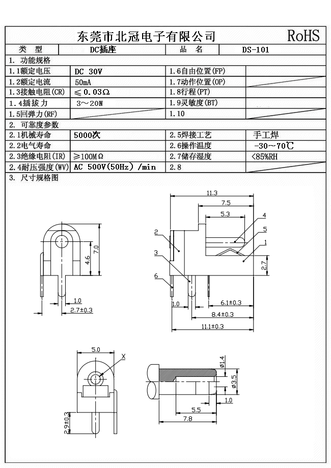 Typical Specifications 1. Rating : DC 30V 0.5A 2. Contact Resistance : 70ΩMax 3.Lnsulation Resistance: DC500V 1Minute 4.Operating Temperature Range: -25℃+80℃ 5.Ambient Humidity Used: ≤85%RH 6. Operating Force : 3-20N 7. Operating Life : 5,000Cycles