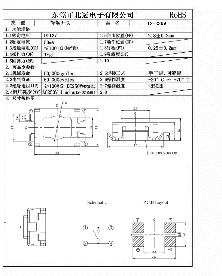 3.Lnsulation Resistance: ≥100mΩ DC250V