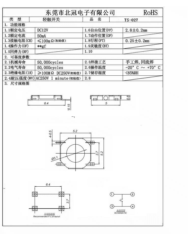Typical Specifications 1.Rating : DC 12V 50mA 2.Contact Resistance: ≤100mΩ 3.Lnsulation Resistance: ≥100mΩ DC250V 4.Operating Temperature Range: -25℃+80℃ 5.Ambient Humidity Used: ≤85%RH 6.O
