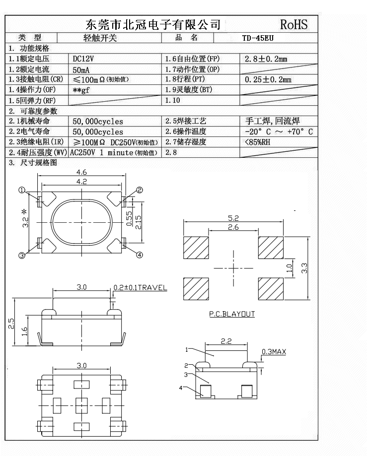 3.Lnsulation Resistance: ≥100mΩ DC250V