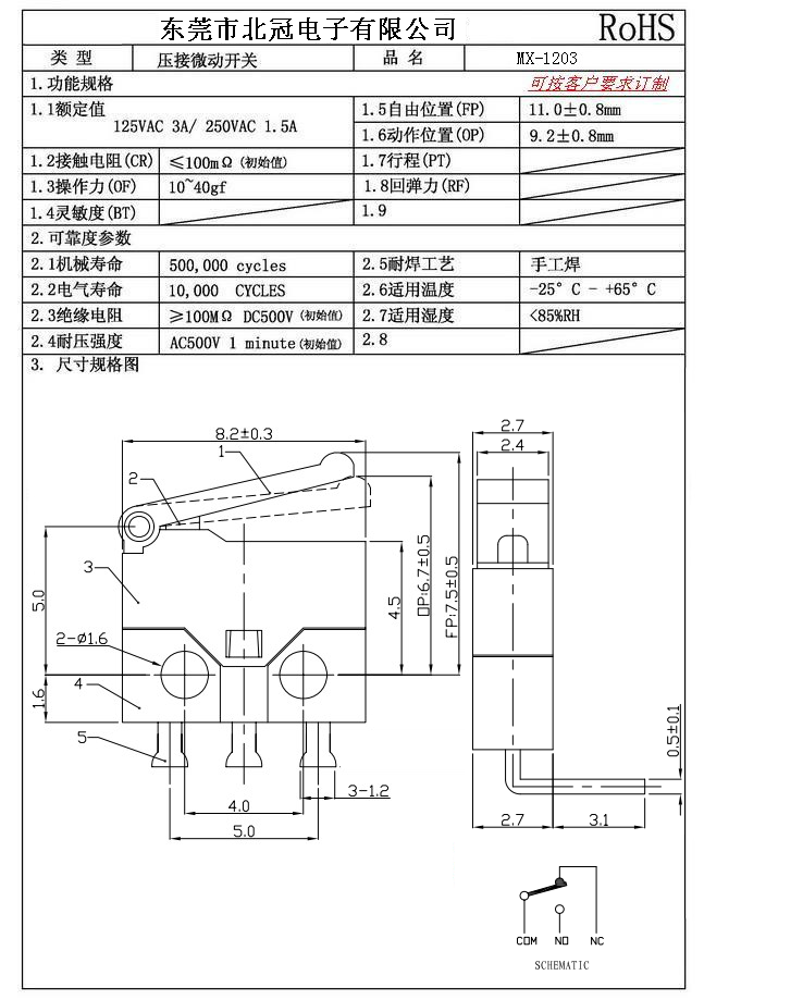 3.Lnsulation Resistance: ≥100mΩ DC500V