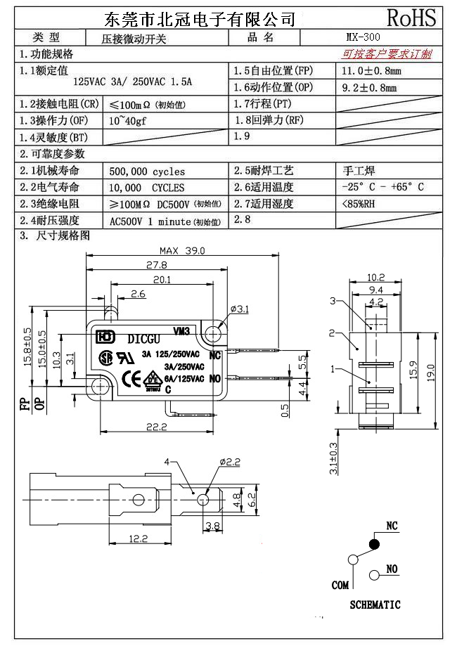 Typical Specifications 1.Rating : DC30V 0.1A 2.Contact Resistance: ≤100mΩ 3.Lnsulation Resistance: ≥100mΩ DC500V 4.Operating Temperature Range: -25℃+85℃ 5.Ambient Humidity Used: ≤85%RH 6.Mechanical Life: 100,000Cycles 7.Operating Force:30±10gf 8.OP:8.8±0.8mm 9.Order: AC 125V 3A