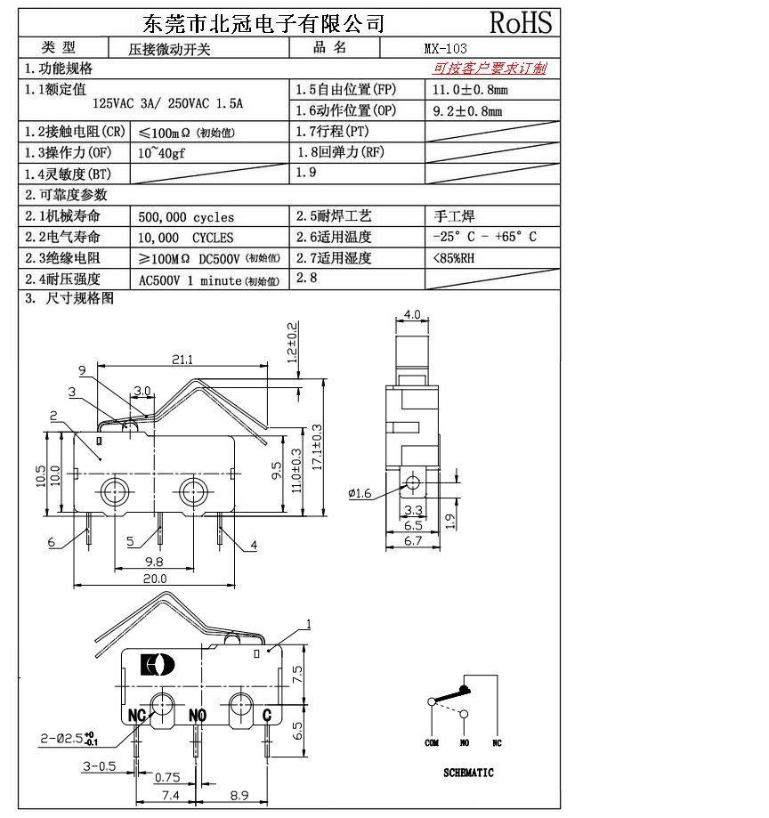 Typical Specifications 1.Rating : DC30V 0.1A 2.Contact Resistance: ≤100mΩ 3.Lnsulation Resistance: ≥100mΩ DC500V 4.Operating Temperature Range: -25℃+85℃ 5.Ambient Humidity Used: ≤85%RH 6.Mechanical Life: 100,000Cycles 7.Operating Force:30±10gf 8.OP:8.8±0.8mm 9.Order: AC 125V 3A