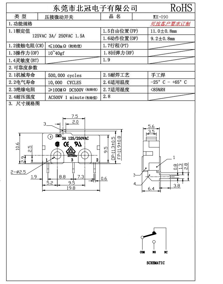 Typical Specifications 1.Rating : DC30V 0.1A 2.Contact Resistance: ≤100mΩ 3.Lnsulation Resistance: ≥100mΩ DC500V 4.Operating Temperature Range: -25℃+85℃ 5.Ambient Humidity Used: ≤85%RH 6.Mechanical Life: 100,000Cycles 7.Operating Force:30±10gf 8.OP:8.8±0.8mm 9.Order: AC 125V 3A