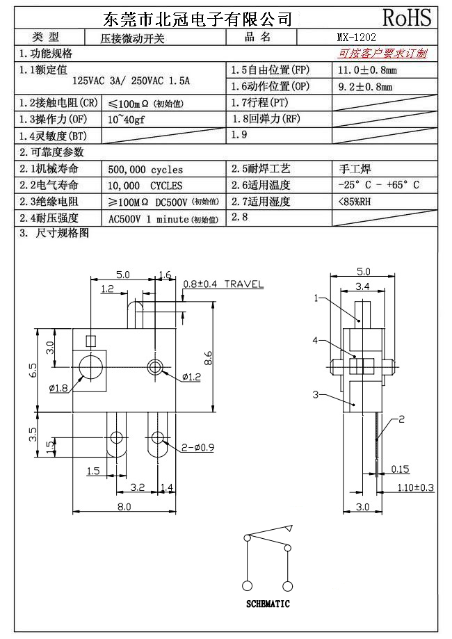 Typical Specifications 1.Rating : DC30V 0.1A 2.Contact Resistance: ≤100mΩ 3.Lnsulation Resistance: ≥100mΩ DC500V 4.Operating Temperature Range: -25℃+85℃ 5.Ambient Humidity Used: ≤85%RH 6.Mechanical Life: 100,000Cycles 7.Operating Force:30±10gf 8.OP:8.8±0.8mm 9.Order: AC 125V 3A