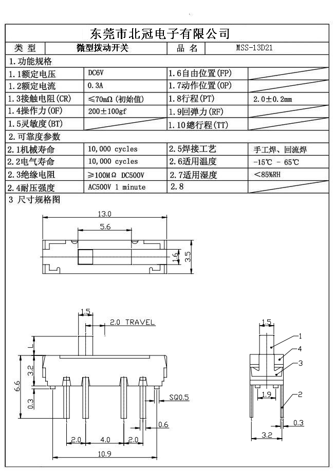 Typical Specifications 1. Rating : DC 12V 50mA 2. Contact Resistance :≤50mΩ 3.Lnsulation Resistance: DC500V 1Minute 4.Operating Temperature Range: -25℃+80℃ 5.Ambient Humidity Used: ≤85%RH 6. Operating Force : 200gf 7. Operating Life : 10,000Cycles
