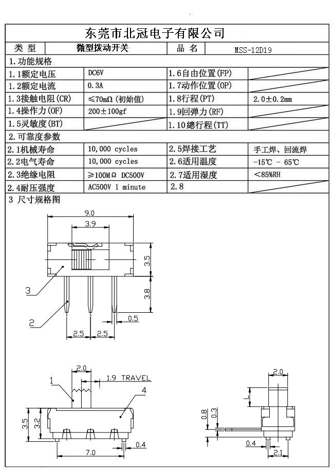 Typical Specifications 1. Rating : DC 12V 50mA 2. Contact Resistance :≤50mΩ 3.Lnsulation Resistance: DC500V 1Minute 4.Operating Temperature Range: -25℃+80℃ 5.Ambient Humidity Used: ≤85%RH 6. Operating Force : 200gf 7. Operating Life : 10,000Cycles