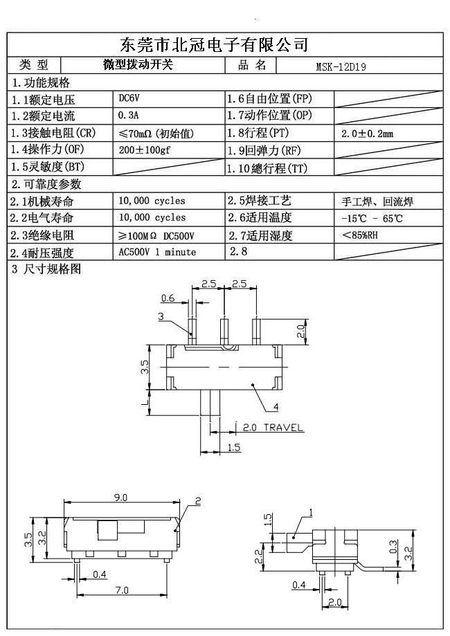 Typical Specifications 1. Rating : DC 12V 50mA 2. Contact Resistance :≤50mΩ 3.Lnsulation Resistance: DC500V 1Minute 4.Operating Temperature Range: -25℃+80℃ 5.Ambient Humidity Used: ≤85%RH 6. Operating Force : 200gf 7. Operating Life : 10,000Cycles