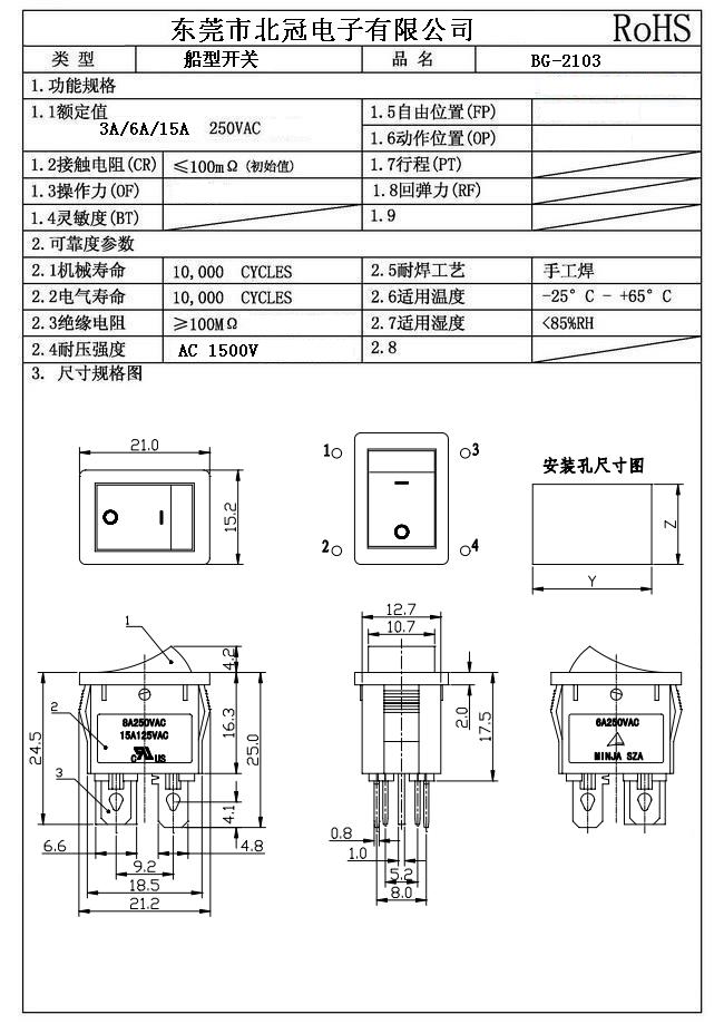 技術參數(shù)〔SPECIFICATION〕 額定電流、電壓: 6(4)A 250VAC 6A/125A 250VAC 6A 250VAC/10A 125VAC 接觸電阻:≤20mΩ 絕緣電阻:≥100MΩ 介電強度:≥1800VAC/3S 電器壽命:≥10000次