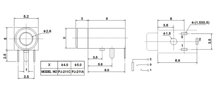 產(chǎn)品名稱:PJ-211A 品名:2.5耳機插座 |