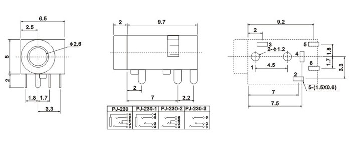 品名:2.5耳機插座 耳機插座技術參數(shù): 1.額定負荷:0.5A 30V DC 2.按觸電阻:100 mΩ max. 3.使用溫度:-20℃~70℃ 4.插拔力:3-20N 5.使用壽命:5,000cycles 耳機插座主要組成部件: 1.塑膠底座 2.磷銅或鈹銅簧片